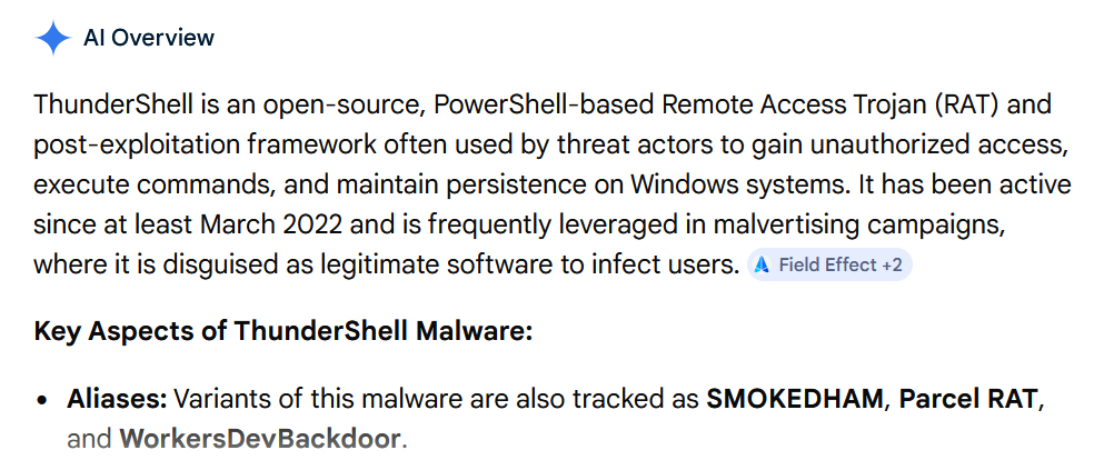 Fast forward to today. During that conference, they discussed active groups such as SmokedHam, Parcel RAT, and WorkersDevBackdoor, all modern C2 frameworks used by attackers. What they all have in common is that they are forks of my original ThunderShell project. Even AI is capable of correlating all of these elements.